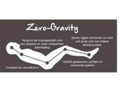 Zero gravity relaxstoelen LafumaDe zero gravity stand is een stand met een hoek van 127 graden waarbij de benen hoger liggen dan het hart. Dit heeft verschillende voordelen. Doordat de benen en voeten hoger liggen dan het hart, wordt de bloedsomloop bevorderd.