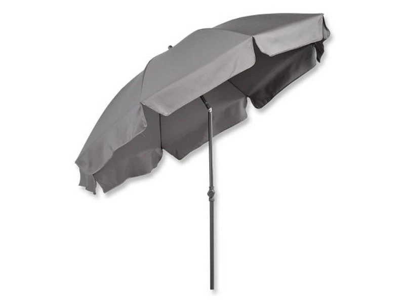 Leuke strandparasol in wit, grijs of ecru. Deze parasol heeft een diameter van 2 meter en een deelbaar frame. Parasol is voorzien van een knikmechanisme.