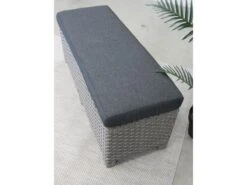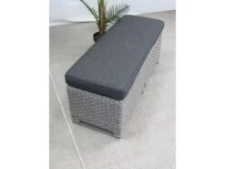 Dit handige 2-zits bankje is bij veel tuinsets combineerbaar. Het bankje is gemaakt van een aluminium frame met daar omheen een 10 mm – halfronde vlechtwerkdraad in de kleur blended grey. De bankje wordt uiteraard geleverd inclusief antracietkleurige kussen.