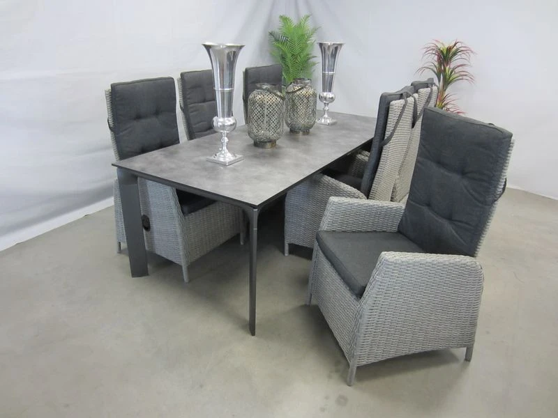 6 verstelbare tuinstoelen met hpl tuintafel 220 x 95 cm.